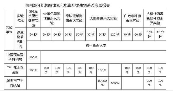(1)概述:酸性氧化電位水是一種具有高氧化還原電位(ORP),低pH,含低濃度的有效氯的水,它是一種無色透明的液體,具有氯味,其氧化還原電位(ORP)大于或等于1100mV,pH值在2.7以下,有效氯含量一般為25 mg/L~50mg/L。它具有較強的氧化氯和快速殺滅微生物的作用,對各種微生物都有較強的殺滅作用。其具有殺菌速度快、安全可靠、不留殘毒、有利于環(huán)保等特點。