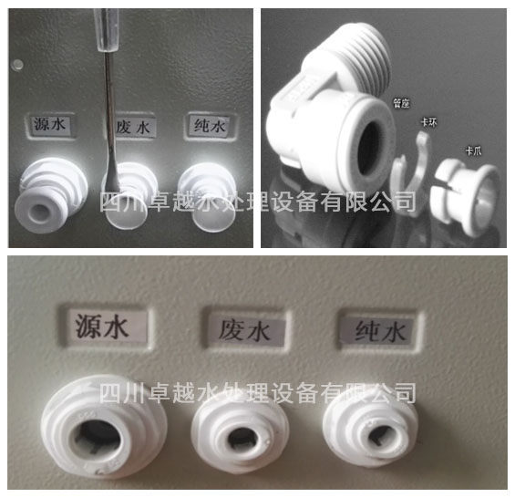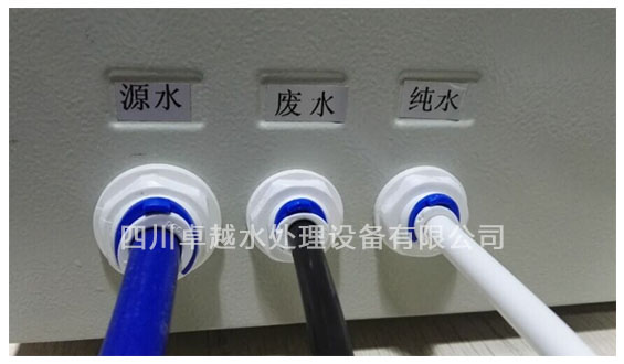 超純水機在出廠前都會用堵頭,堵著源水,廢水,純水三個接口。如圖所示: