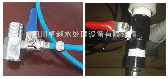 二、在配件箱里找到藍色PE管,然后與不銹鋼三通接頭連接,并連接自來水。藍色PE管另一端連接到純水機源水接口即可。如圖所示: