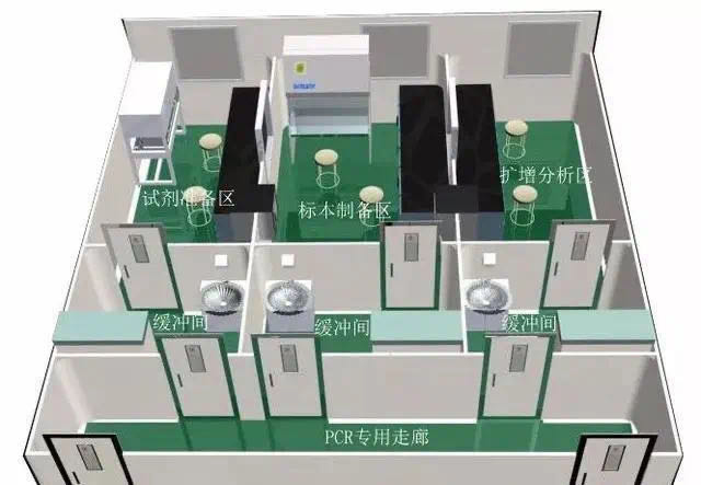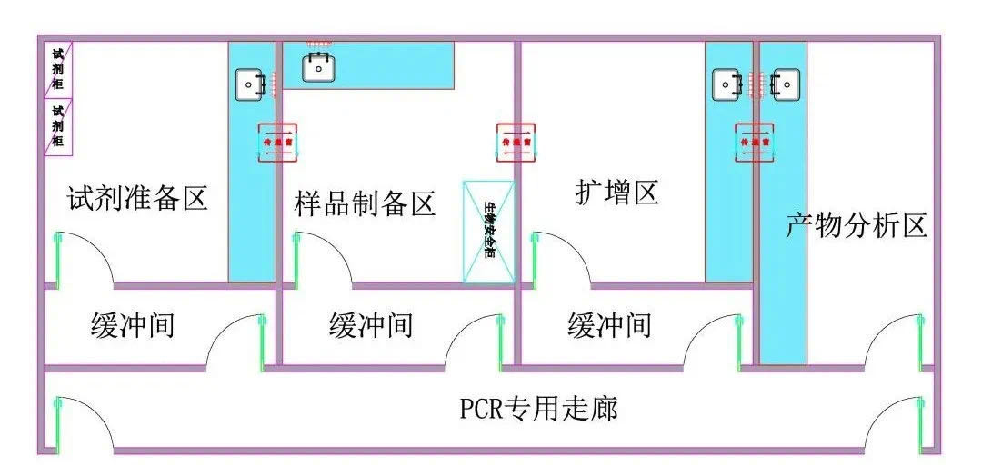 PCR實驗室原則.上分為四個單獨的工作區域:試劑準備區、標本制備區、擴增區和擴增產物分析區。為避免交叉污染,進入各個工作區域必須嚴格遵循單一方向原則,即只能從試劑準備區→標本制備區擴增區>擴增產物分析區,不得逆向流動,并且各區完全獨立,如為一個區套一個區的模式,區間不能直通,則必須建有緩沖間,保證兩個區域間始終處于隔離狀態。