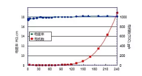 我們向純水水箱中逐漸加入蔗糖(有機物),水箱里的水再經過超純水機純化,觀察超純水的電阻率和TOC數值的變化,如下圖: