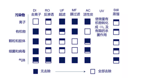 由上表我們可以看出,沒有一項純化技術(shù)能夠?qū)⒆詠硭械奈廴疚镔|(zhì)完全去除,所以想要得到比較純凈的水,需要結(jié)合多種純化技術(shù)來完成。