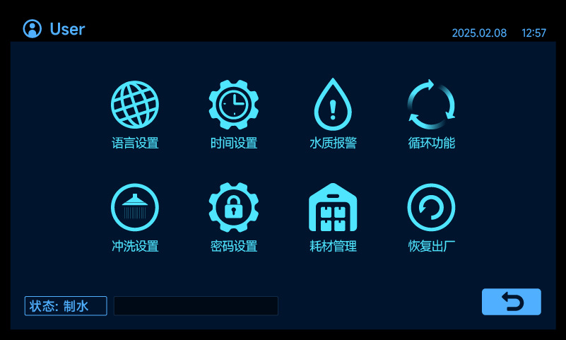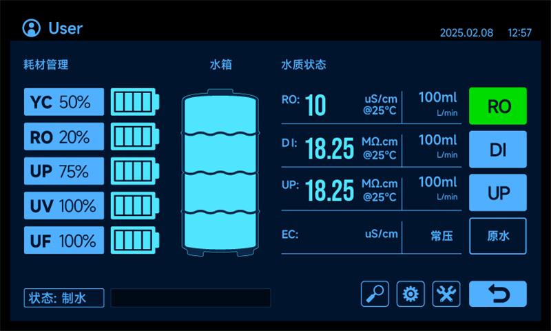 ★全自動微電腦控制,7寸彩色觸摸屏人機操作界面(尺寸1540*85mm),動畫顯示工作模式,中英文雙語言自由切換,圖示化顯示耗材壽命、儲水狀態、水質狀態等運行參數,可選配物聯網(LOT)和云端遠程管理平臺,實現遠程診斷、監控、日常操作及儀器和云端雙備份運行數據信息。